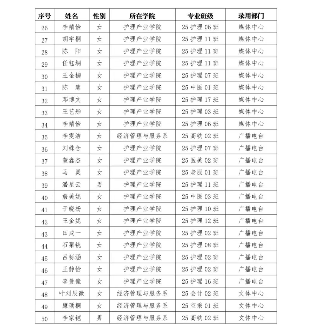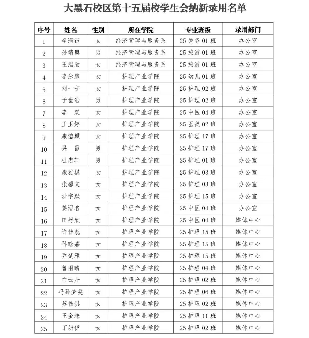 本次纳新工作历经自主报名、资格审核、初试、复试、笔试考核、各部门讨论及主席团全面考察等多个环节,充分征询竞选人员意见后,经校团委研究评议,最终遴选出辛滢钰、孙靖奥等84名同学成为大黑石校区第十五届校学生会工作人员(项目志愿者),试用期为1个月。录用同学分别来自经济管理与服务系、护理产业学院等多个教学单位,涵盖关务、旅游、护理、中医、医美等多个专业班级,将分别任职于办公室、媒体中心、广播电台、文体中心、社团管理中心等部门,为校学生会注入新鲜血液。为保障纳新工作的透明度与公正性,现将录用名单予以公示,公示期为2025年10月11日至10月15日。公示期间,如有异议,相关人员需实名前往学生一站式服务大厅团籍团建窗口(5号教学楼2楼202室)反映情况,逾期将不再受理。校学生会作为联系学校与学生的重要桥梁纽带,此次纳新为广大学生提供了锻炼自我、服务他人的良好平台。希望新录用的学生骨干能够以高度的责任感和使命感投入工作,拧成一股绳、聚成一团火,在服务同学、建设校园的道路上携手拼搏,充分发挥先锋模范作用,为推动学校团学工作高质量发展、书写校园精彩篇章贡献青春力量。未来,校团委也将持续加强对校学生会的指导与管理,助力学生组织不断提升服务效能,更好地满足广大学生成长发展需求。