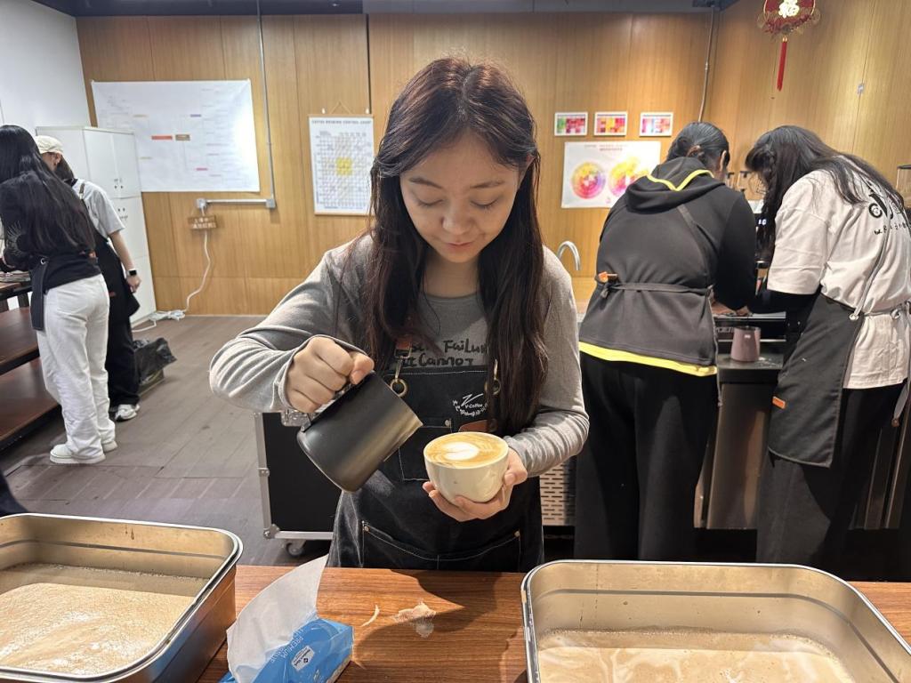 实操环节中,麦尔孜耶动手实践,在咖啡师的指导下,依次完成研磨咖啡豆、冲泡手冲咖啡、制作拉花等步骤。她从最初的略显生疏,到逐渐掌握技巧,当一杯香气四溢、带有精美拉花的咖啡呈现在自己眼前时,麦尔孜耶脸上洋溢着满满的成就感。